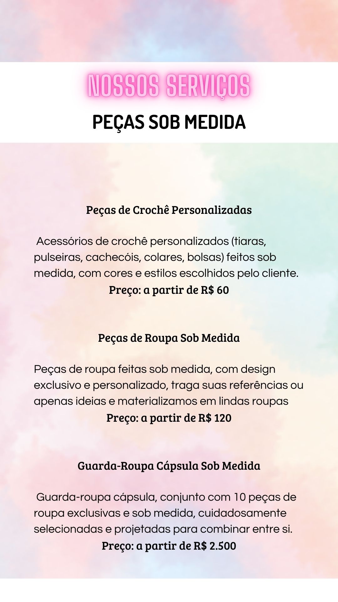 Conheça aqui nossos serviços exclusivos sob medida. Gostou de algum e gostaria de mais informações? Clique aqui e preencha com seus dados ou fale conosco diretamente pelo whatsapp que retornaremos assim que possível. Entenda aqui como o processo de encomenda sob medida funciona.